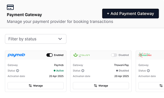 Connect your preferred payment methods and start receiving money instantly. Shabik supports global gateways, local options, and flexible rules like deposits or pay-on-arrival. You can switch, enable, or disable providers anytime from your dashboard.